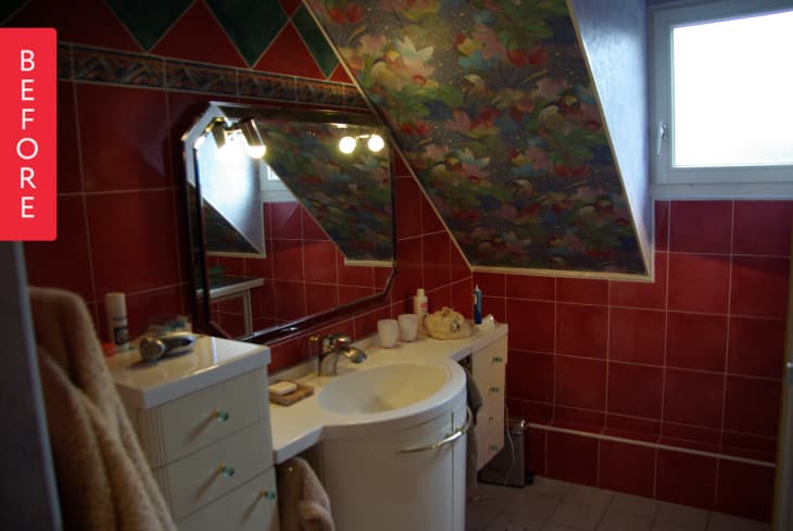 Well, this sure is something. We strongly suggest you hit the zoom on the wallpaper…we’ll wait. Now that that’s out of the way, Sophie’s bathroom was dark and crowded but after smartly adjusting the layout and changing basically everything about the “before” room, she now has a light and adorable space.