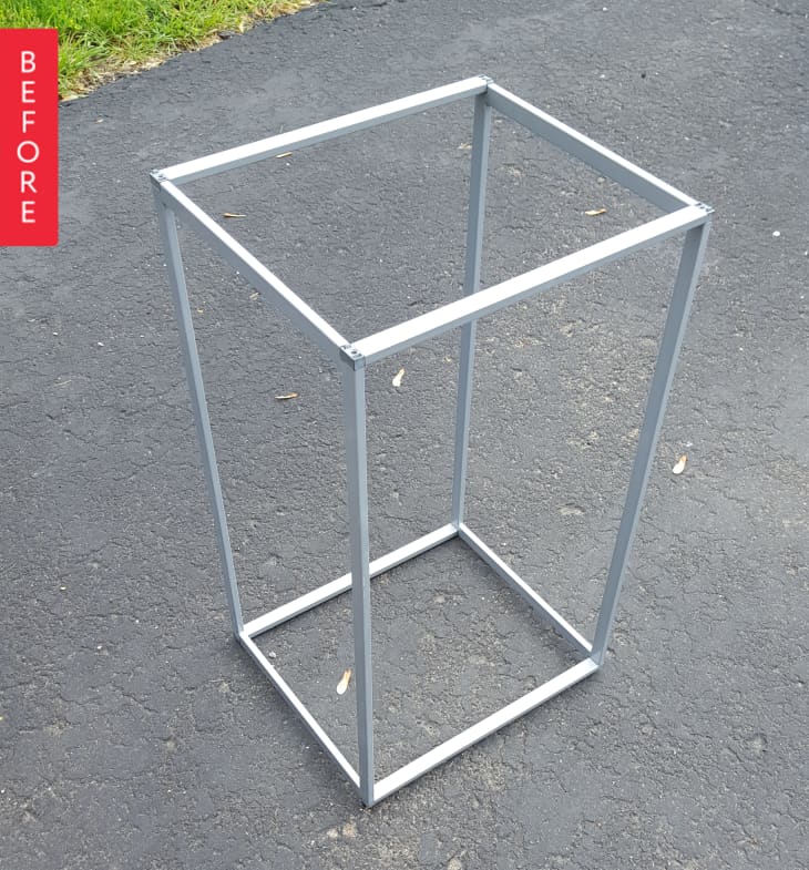 The key to this hack was finding an old kitchen cutting board that was taken from a kitchen remodel years ago. When I turned it over, I was amazed to see this almost pristine wood grain, kind of like cherry butcher block. I simply cut it out and applied a couple of coats of poly and the color turned out better than I expected. Last step was finding some black screws and fastening the wood from the underside of the frame. Love the table and the clean look!