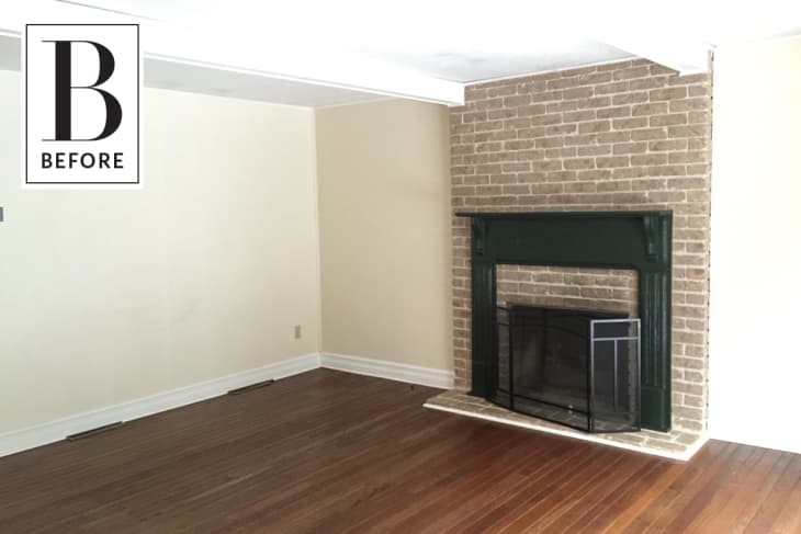 From Liz: When we bought our home it was very traditional and not our style at all. The walls in the room were a warm beige, the fireplace brick was painted with some sort of faux finish and the mantle was green.