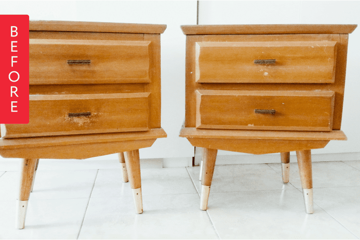From Lucas: When I found these nightstands, they were full of scratches and the wood tone wasn’t my favorite, but I loved their mid-century details and petite size.