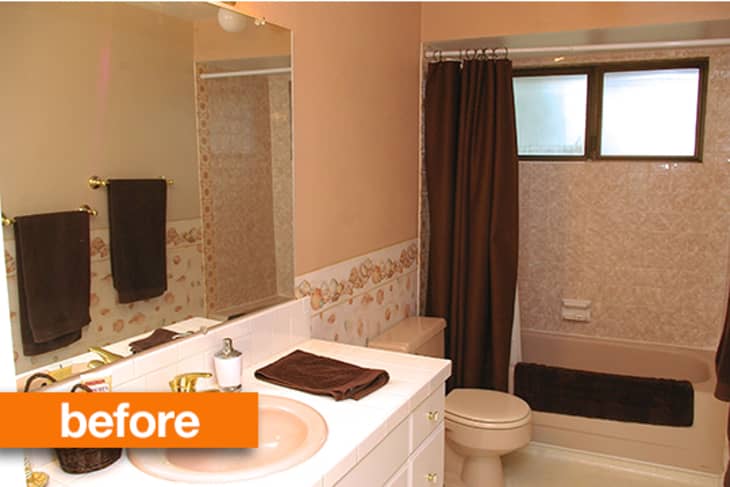Sometimes a quickie is all you need, and this refresh shows that there are some easy ways to make the most of an outdated space. New paint, towels, a shower curtain, and pulls helped neutralize the pinky-peach hue of the fixtures and tile, and some thrift store art added a warm dose of color. What was once a sea of flesh-tones is now a fresh, inviting space.