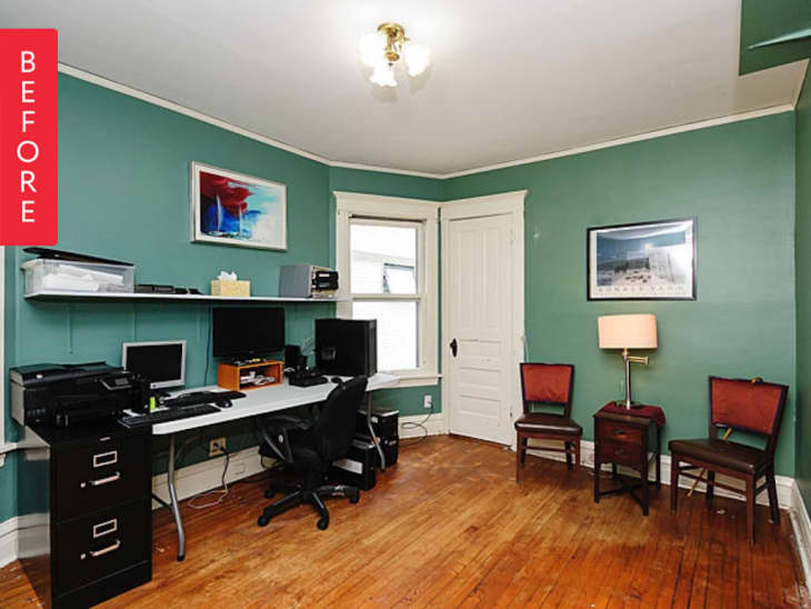 From Adie: When we purchased our home, one of the bedrooms was being used as an office. It had green walls and shelves everywhere. The floors were in rough shape, but the room has great natural light and is quite spacious. We added an overhead light and refinished the floors before we moved in, and then continued the process of converting it back to a bedroom after moving in.