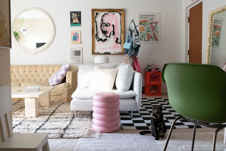 Liz didn’t want to spend a ton of money decorating the apartment she shares with her daughter, Olivia, but she also didn’t want to compromise on style. Rather than outfitting the space with all high-end pieces, she focused her funds on well-made furniture and picked up decor from thrift stores and Facebook Marketplace (and DIYed artwork with her young daughter). Spending more on furniture usually means it’ll last longer, while dishing out less for decor allows you to swap out pieces when you want a change. Best of both worlds!