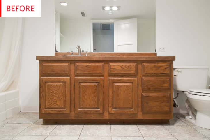The showpiece of this petite bathroom is its oversized hex-patterned marble tile floor, which extends into the shower. “We absolutely love the way the hexagon floor tile turned out—it’s bold without being overwhelming in a small space, and it gives the room an upscale sort of feel,” blogger Faith Towers Provencher of Design Fixation says. You can find the same tile at The Builder Depot.