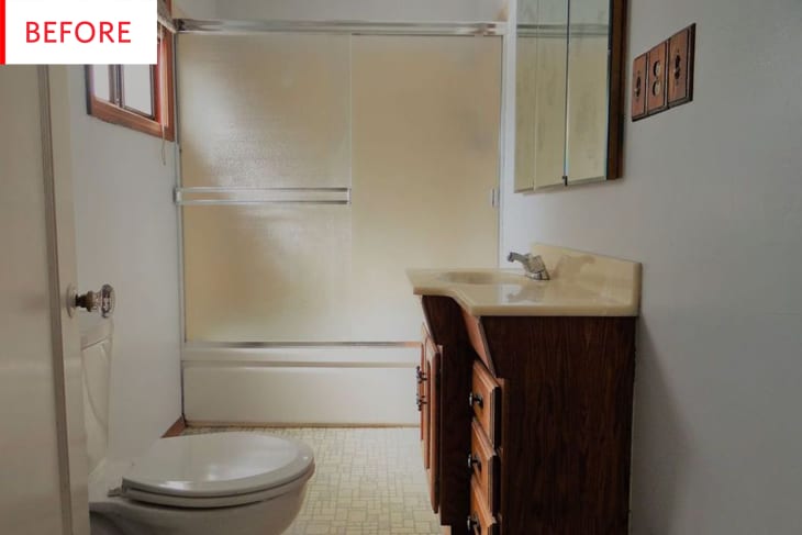 We moved into our 1920s Portland, Oregon bungalow [in] September 2017. We have been moving at full speed to turn this little house into a beautiful space. The worst offender was our 1970s bathroom. It had peeling linoleum, a horror film shower, and a vanity that was literally falling off the wall. We hated showering in the space to the point where we would keep the lights off to not see our surroundings!