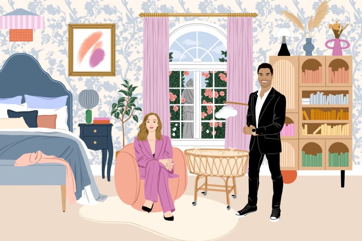 Mother Nature is special to the loved-up couple — after all, they did share their first kiss in a garden — so they’d incorporate earthy elements into this bite-sized space. (Botanical wallpaper? A rattan bassinet for their new bundle of joy? Yes, please.) Though natural elements speak to the couple’s courtship, they’ll also add tiny touches that will speak to their individual roots. Daphne will keep a portrait of her family nearby, while Simon will tend to his regal roots velvet curtains, plush bedding, and an elegant wingback chair.
