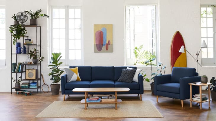 Like I said, the sofa is totally modular. If we decide to take off a seat for some reason (like after moving into a smaller space, perhaps), we can do that (and add more as well). This piece actually grows with you, and I feel pretty confident that I’ll have it for a very long time. That also has to do with the quality — it’s upholstered in a tight olefin fiber weave that’s naturally scratch- and stain-resistant, and the frame is made of sturdy birch. It’s also just really pretty, with a classic mid-century modern design and attractive (and practical!) navy fabric. (You can also pick gray, white, red, and charcoal.)