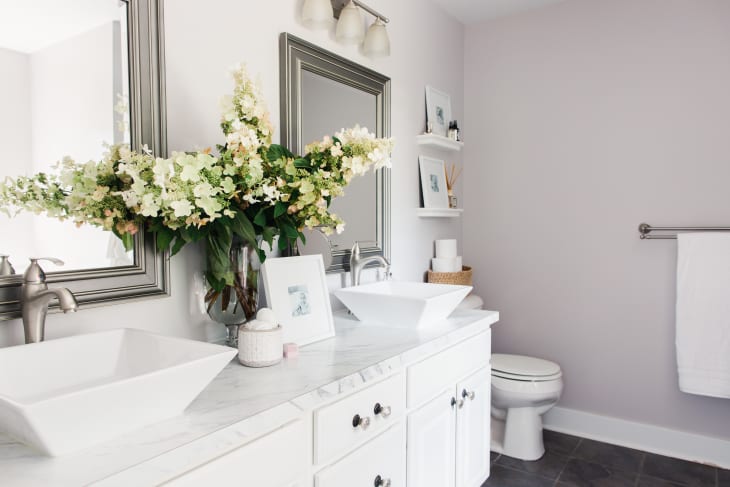 As much as I love for things to be clean, the actual cleaning part is not my favorite. I try to remove any and all barriers (read: excuses) that get in the way of a sparkling-clean bathroom. I’ve found that if there’s nothing, or almost nothing, on the floor, I’m more likely to sweep and mop when I notice the bathroom needs it. But if I have to pick up a toilet brush to make it happen, that floor will stay dirty until the next deep clean.