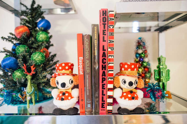 Perkins also showed that you don’t need double faux firs to shout “Christmas!” in your living room. Pack your bookcase with colorful mini trees, old-fashioned snowman bookends, and toy soldier figurines.