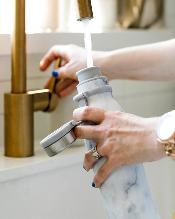 I’m so invested in cutting down on the time it takes to clean water bottles that I had a glass rinser installed in our new kitchen. Its powerful spray of water drastically cuts down on the time it takes to do daily cleanings, and I’m so glad I got it.