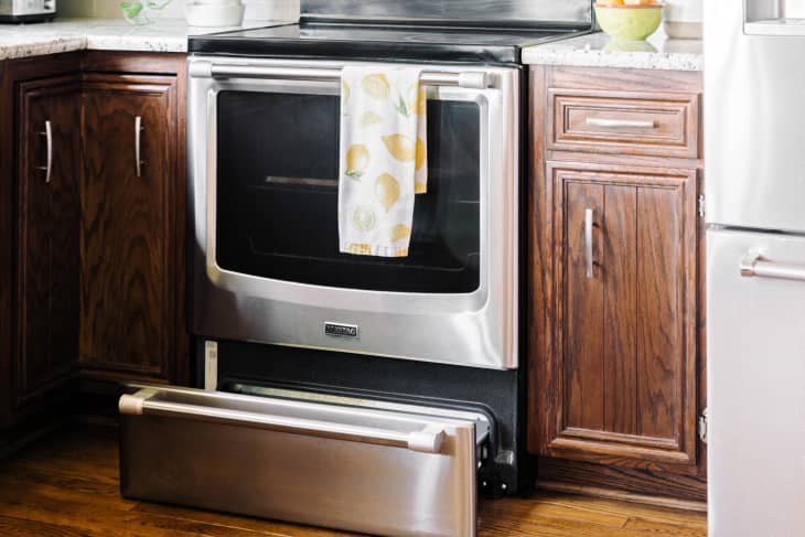 Until now, that is! One of Kitchn’s favorite TikTok follows, Texas-based cleaning pro Vanesa Amaro, recently shared a game-changing hack for getting between the oven’s glass panels. First, she says, remove the drawer below the oven. Then, if you get low to the ground and look up, under the door, you should see slots that allow you to reach the glass panels. That’s where you’ll use a cleaning tool to remove all that built-up grease and grime!