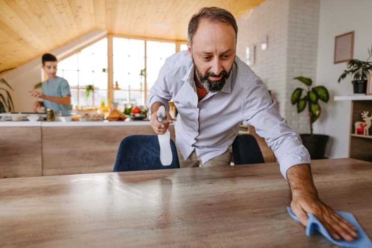 Wallach keeps a separate scrubby sponge for counters only. “I use dish soap and get the sponge soapy, and then scrub the whole counter. Then I take a dishcloth, wet it, and wipe the soap off,” he says. “It’s quick and efficient and you don’t go through a million paper towels or have to use harsh chemicals.” If he wants to polish the counters afterward, he uses a solution of white vinegar and water.