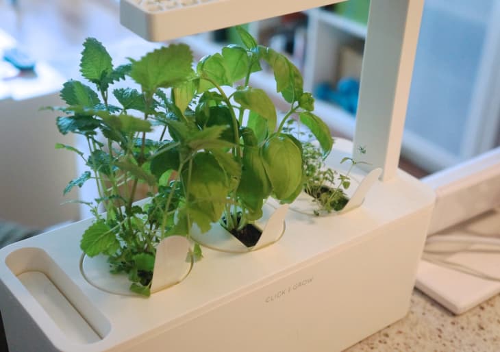 Originally launched via Kickstarter, the Smart Herb Garden ($99.95) by Click & Grow promises healthy plants as long as you provide the water and power. The device, which has a relatively small (13.9 x 4.96 x 12.1 inch) footprint, plugs into the wall and has a built-in LED grow light and water tank. This water tank only needs to be refilled every 3 – 6, weeks which is great news for those who often forget to water their plants, or find themselves frequently away from home. Beyond the light and the water tank, the real power of this system is the soil. Click and Grow calls this soil their “nano-tech growth medium” and says that it will give the plants the right amount of water, oxygen, and nutrients at all times. The Smart Herb Garden comes with three herb garden cartridges — basil, thyme, and lemon balm — and these cartridges are filled with the aforementioned nano-tech growth medium. The carriages, or refills, drop right into the garden base, and it’s easy to remove and replace them.