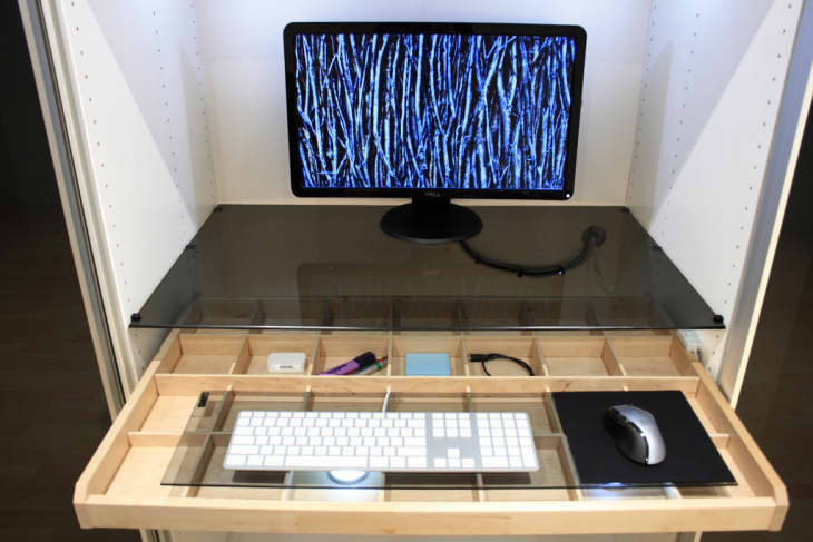 I trimmed down the two compartment rows to make the keyboard area a flat surface. There are two lights beneath the keyboard and mouse to add light and the remaining compartments are used to store stationary. The glass was salvaged from a small cupboard someone had kindly placed on their front lawn on hard rubbish day. Just a fluke it is the same tint as the Ikea glass.