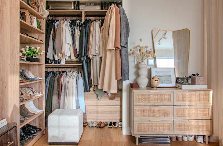 Her method is surprisingly simple: Every weekend, before her workweek starts, she irons and prepares every outfit she plans to wear for the week. Once everything is pressed, she assembles each full outfit — slacks, blouse, blazer — and hangs them together in order from Monday through Friday. Beneath each hanging outfit, she places the corresponding pair of shoes so they’re ready to slip on (instead of tucked away in boxes). She even sets aside accessories like earrings or cuff links to go with each look.