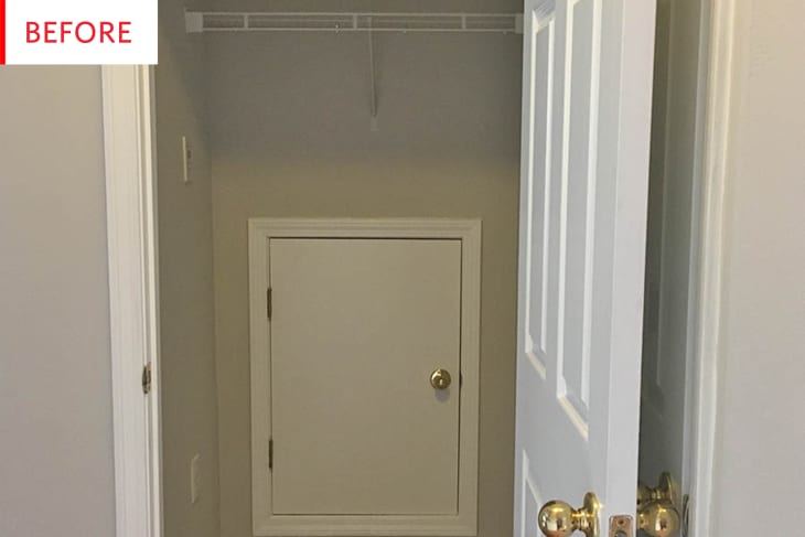 Other than the John Malkovich/Narnia door in the back, this was a totally ordinary closet. Thanks to a clever vision, some spatial strategizing, and a bunch of affordable accessories from IKEA and Target, this closet is now a super-handy mini-mudroom — and the whole makeover cost less than $100.