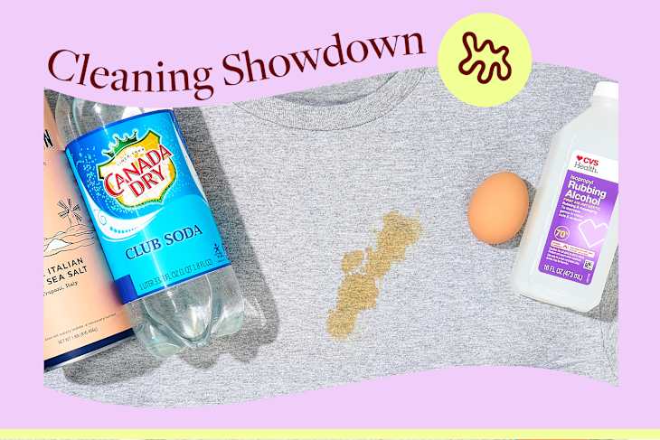 t-shirt with a coffee stain and a few cleaning products with text that reads "Cleaning Showdown"