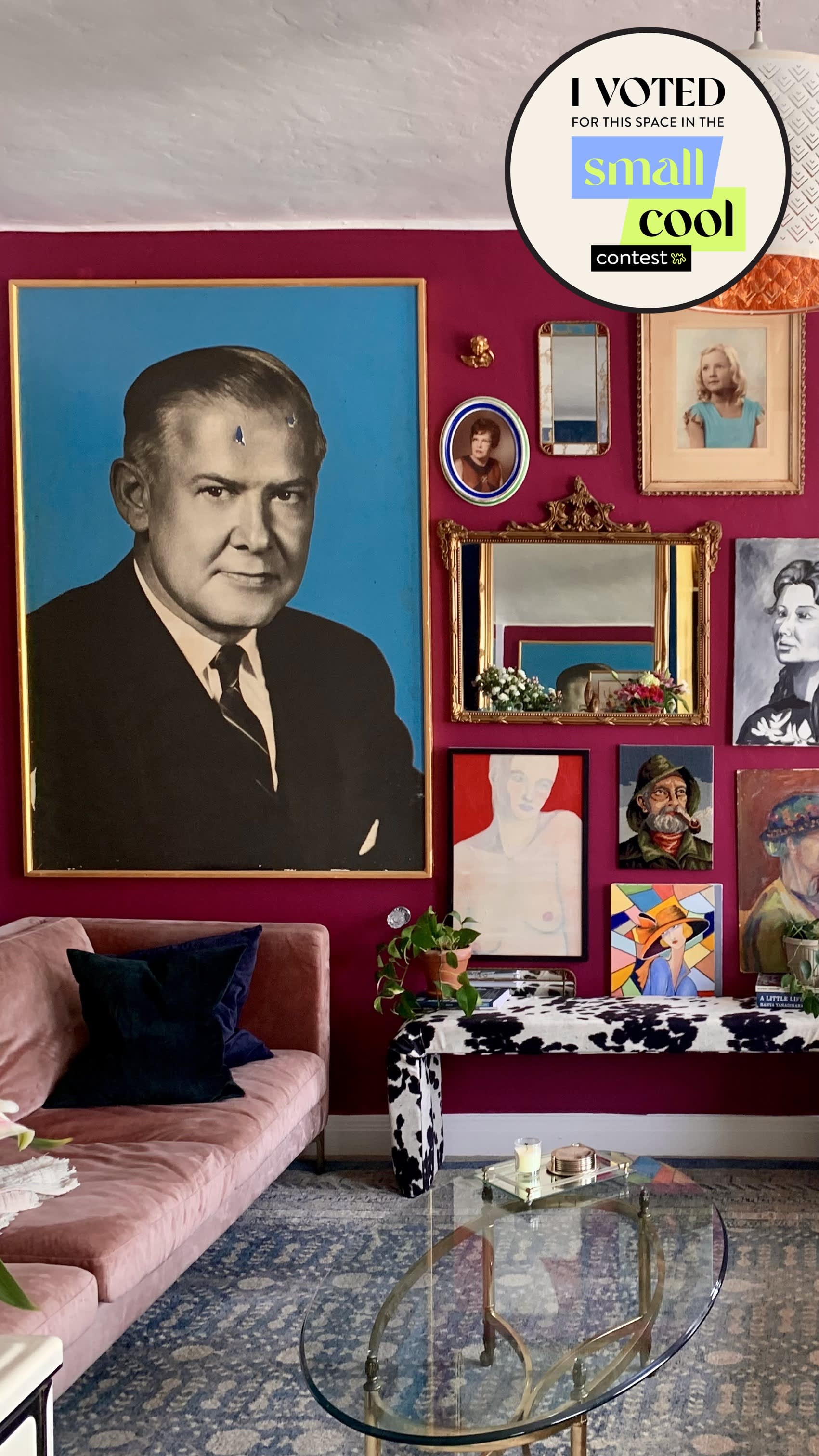 I've utilized vertical space where possible — mounting lucite shelves in my kitchen, stacking up pots and pans, and hanging everything I can. But my most significant small space innovation has been to commit to a bold interior design — I have a decorative stove, two velvet sofas, four bright paint colors, and over 20 vintage oil portraits! It's easy to psych yourself out about things feeling cramped or busy, but you won't know unless you try! I've found that large furniture, bold colors, and lots of mirrors to reflect light have made my small space feel much more spacious and inviting.
