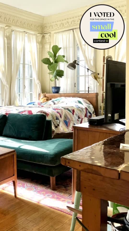 No furniture was specifically acquired for this space, and the emerald velvet sofa is the only piece of furniture purchased new. The rest is vintage, either found on Marketplace or inherited from family. My bed frame is from my grandparent's wedding bedroom set, and the quilt was sewn by her as well.