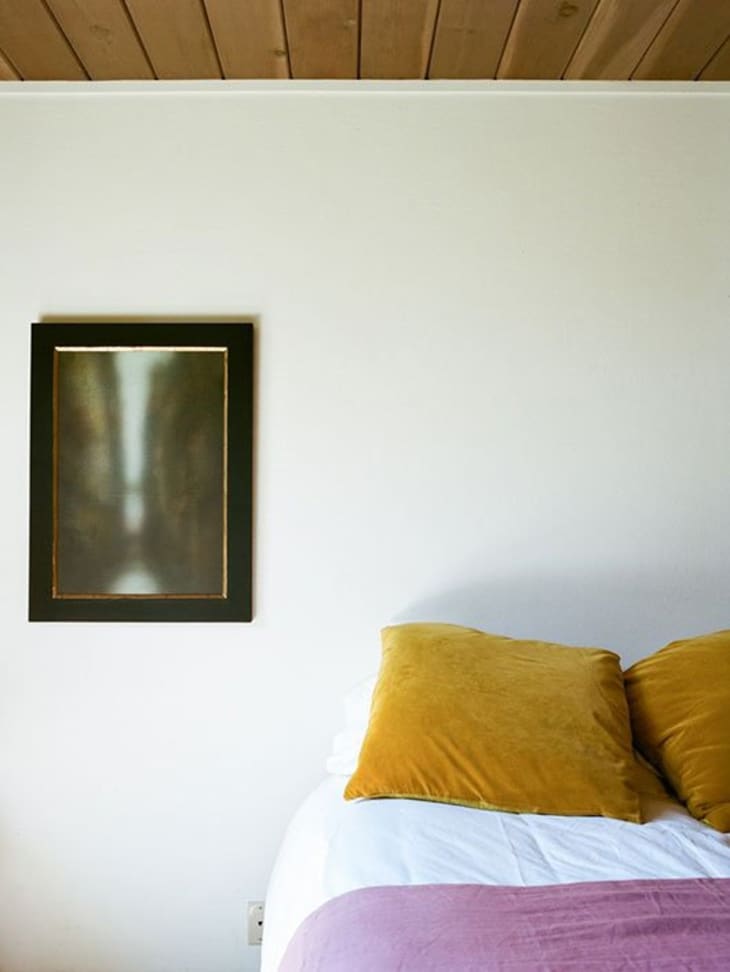 In Leslie Williamson‘s bedroom, above—featured in Freunde Von Freunden—a pink bedspread and mustard velvet pillows are juxtaposed with crisp white sheets and a dark work of art.