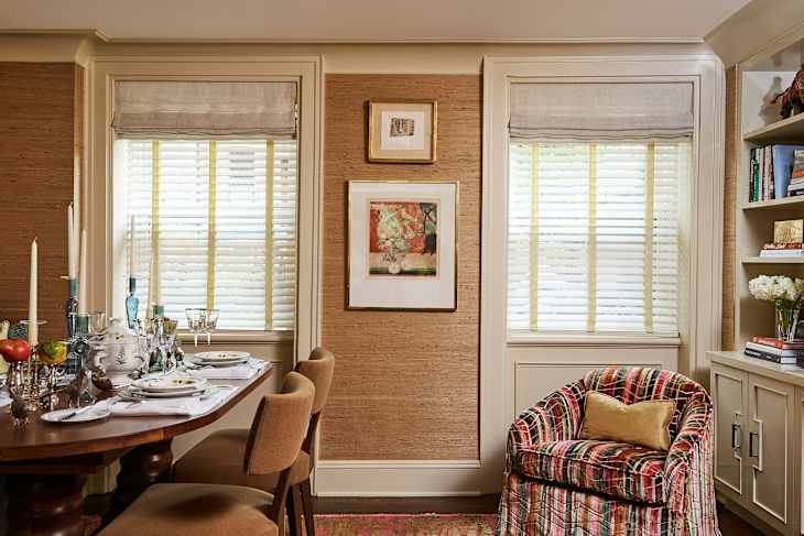 The Parkland Wood Blinds can even be enhanced with decorative tapes. These trimmings come in a variety of colors and patterns, an example of which you can see at the top of the page in this Brooklyn show house dining room by Rinehard Miller Interiors.