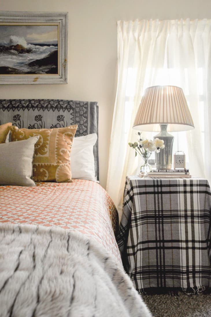 Looking to feature a hue that isn’t blue or white? Blogger Julia Berolzheimer proves that grandmillennial spaces look lovely with peppy purple accents, too. Her fabric headboard, faux bamboo nightstand, scalloped pillowcases, and stunning ceramic lamp are making us want to move right in.
