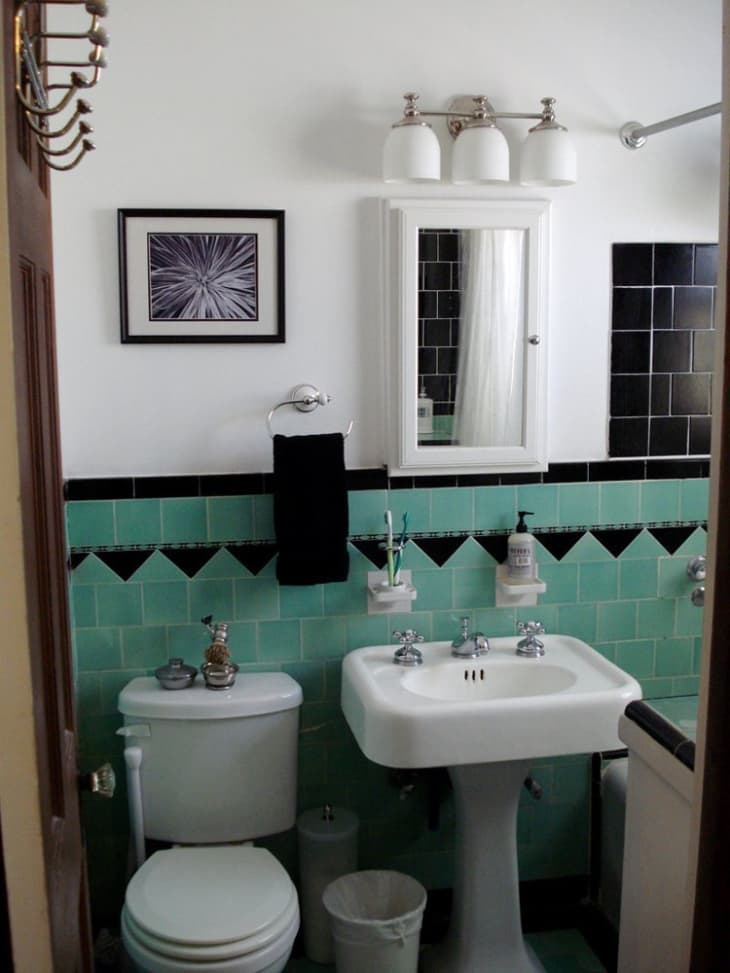 - Paul and Tyra’s Eclectic Charmer: When you inherit a roomful of colorful tile, black and white are your best friends. The lights, mirror, art, and accessories here all work with the tile, while keeping things looking modern.