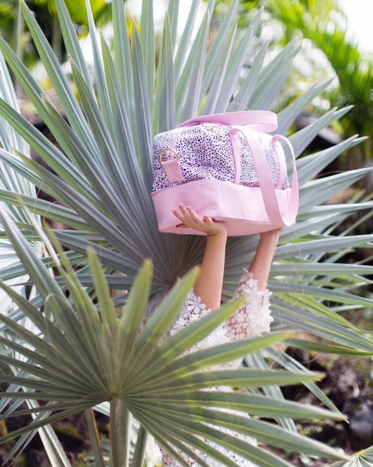 Using playful hues like pink and mint grounded with black, the collection includes plenty of fun touches: The animal print of the travel duffle lines the hard-sided suitcase, and the abstract beachy waves of the tote bag pop up again inside the fabric suitcases and the backpack. The hardcases also have a gold hexagon emblazoned with “Let’s Go” on it.