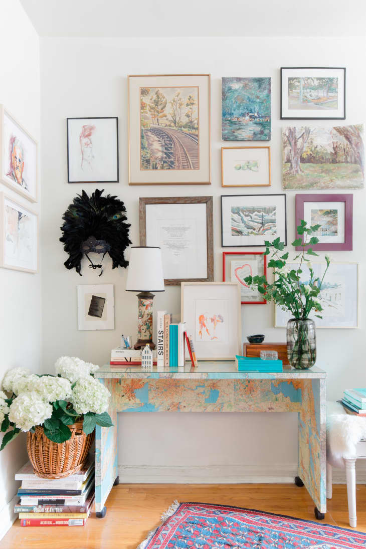Not only does this thoughtful touch make an old desk stylish and sustainable, but picking certain kinds of images can also make your decoupaged piece more meaningful and sentimental, too. You can’t put a price on that. “I’ve surrounded myself with everything I love, so it feels like the ultimate in luxury and comfort, despite — or perhaps because of — its petite-ness, Spooner says. “It’s my refuge from the wild and crazy (and exhilarating) antics of NYC.”