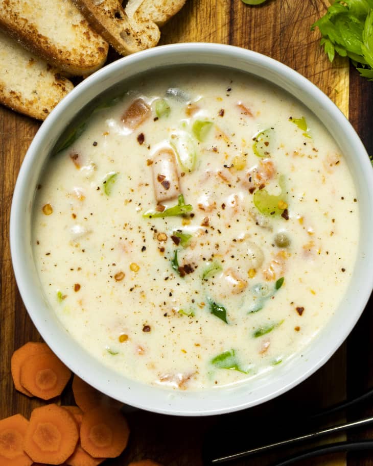 Start by melting butter in a large saucepan. Add flour, garlic powder, onion powder, white pepper, and salt; stir until well-combined. Allow the mixture to simmer for one minute, then whisk in the chicken broth and mixed vegetables. Let the mixture simmer for five minutes before using a potato masher to mash the vegetables into your desired consistency (I kept things on the chunkier side for my attempt). When ready, stir in the half-and-half and continue to simmer for 5 additional minutes. All that’s left to do now is grab a tasting spoon to sample the final product and season as needed before serving with your choice of rolls, cornbread, or biscuits.