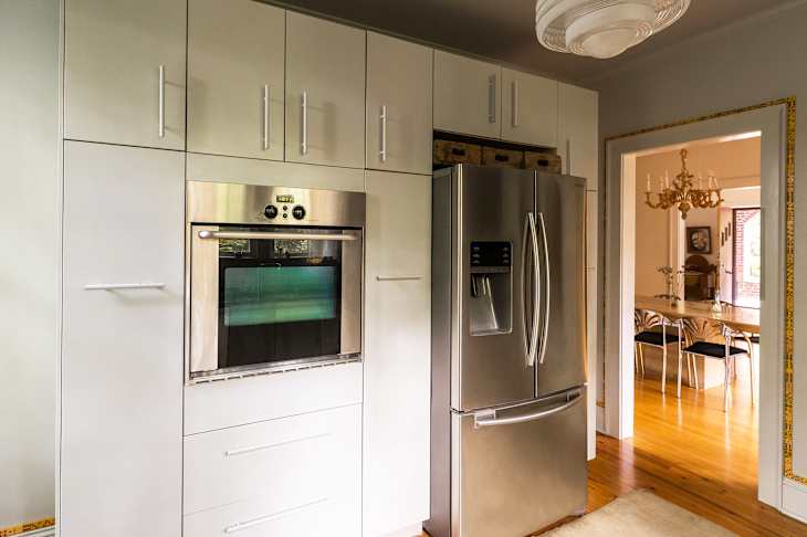 “It is a playful nod to trimmed kitchens of the 1930s, the era of our home,” Katherine says, and her kitchen makeover incorporates other vintage-inspired elements, like square tiles, the large 1930s painting that hangs by the doorframe, a gilded sconce from the 1960s, and an antique wooden upper cabinet. To read more kitchen makeover details, check out the previously published Before & After post.