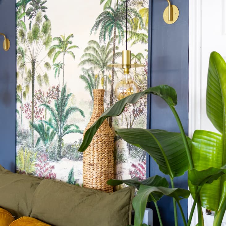To create a removable (and rental-friendly) base for the “mural,” Amara applied a layer of clear self-adhesive book cover film to the whole wall. Once the vinyl was in place, she was ready to mount the black-and-white floral duvet she found at H&M Home to the wall. First, she cut the duvet’s seams so it would lie flat and then adhered it to the wall with wallpaper paste, smoothing out any air bubbles. As a finishing touch, she used watercolors to bring the duvet to life, painting over it to make it look like a vibrant, bespoke design. Finally, she painted the rest of the walls navy (also over the film) then added thin pieces of molding, also painted the same navy, to frame out the “mural.”