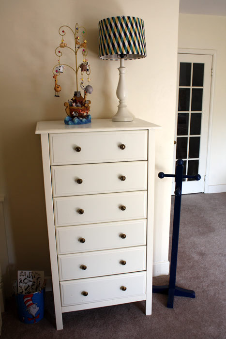 • Elijah’s bureau and chest of drawers was ordered from Target, and then the knobs were changed from wood to brass by the Brass Queen (me).