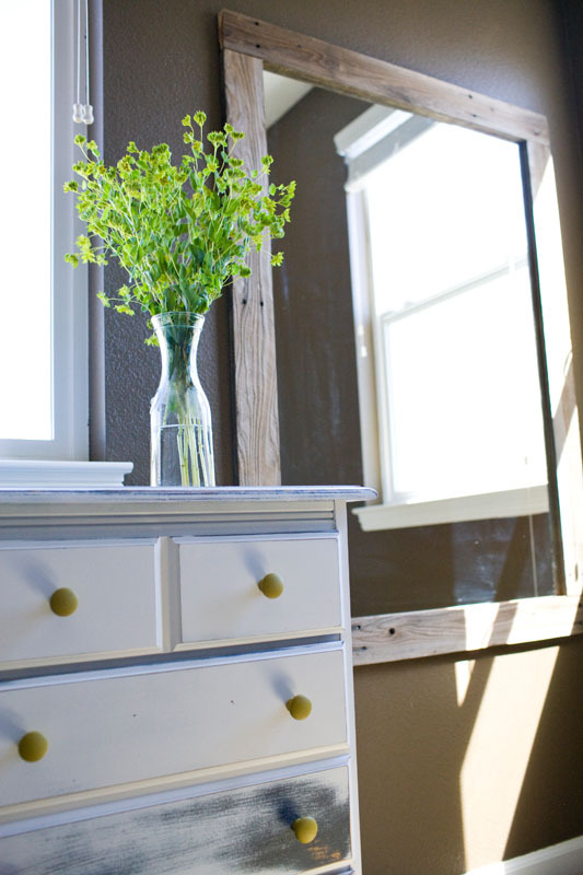 • The kitchen wall with the wood was made from old fence wood we found thrown out in a field. We put a thin sheet of wood behind the area we covered, screwed it into the wall and wood glued most of the cut pieces onto that – with a few screws to hold it all into place. The shelf in the living room was made with that same wood (and some Anthro fixtures) and the mirror in our bedroom was also framed with it as well.