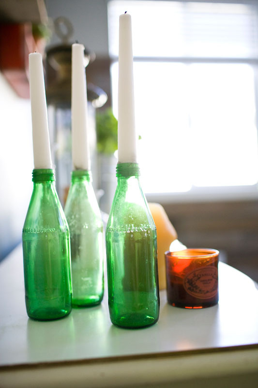 • I also liked making those little candle holders with the green Pellegrino bottles – I just melted then end of the candle and stuck them down while the wax was still moldable.
