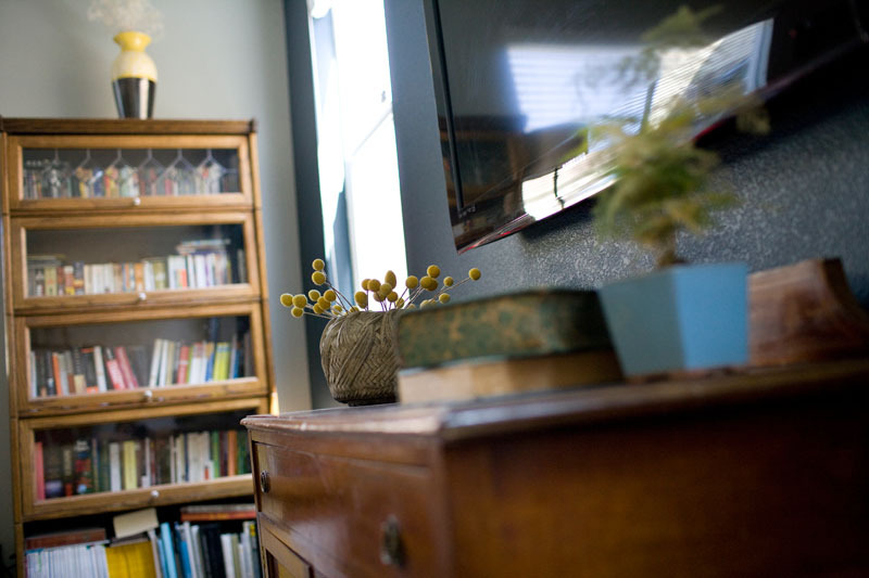 Proudest DIY: Hmmmm. I already mentioned the wood wall – and since that’s kind of a given I’ll talk about something else… our “media cabinet”. I love that we found the perfect antique to hold all of our electronic devices for the TV! Random fact about me, I really don’t like having a TV in plain view (I would love for it to be inside a media cabinet with closed doors!). This was a comprimise for my husband and I. We ended up with a sleek TV and no wires or chords – with a sweet piece of furniture I could live with. Everything turns on through closed cabinet doors using an RF signal converter (and don’t ask me what that means!).