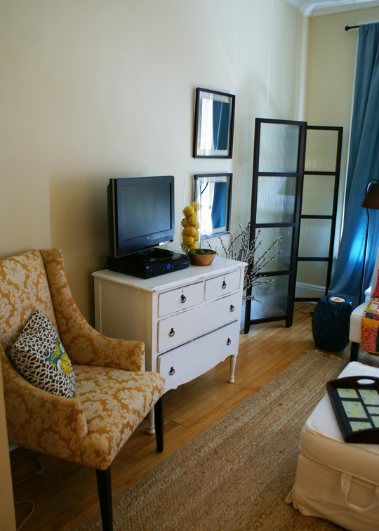 My/Our style: My style has always been very organized, clutter-free, light and bright with a tendency towards clean, straight lines and white. With this apartment, I decided it was my chance to be totally girly, fun, and a bit more shabby-chic than previous apartments. I’m fairly traditional, but love unexpected touches of quirkiness to make me smile.