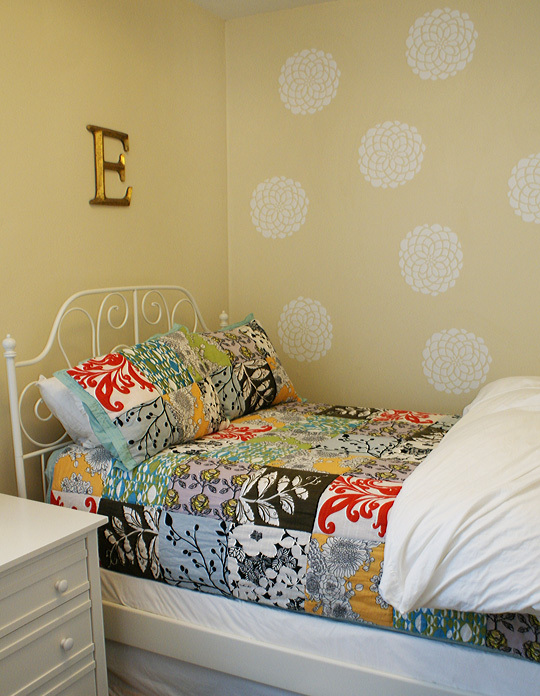 Emily’s crafty guest room is just the beginning of her stylish home. The dining room, with its refurbished dining table and chairs, is an example of Emily’s DIY attitude. The living room, with the wall of art behind the white sofa, is inviting. The little craft room/home office is perfectly appointed for weekend DIY projects.
