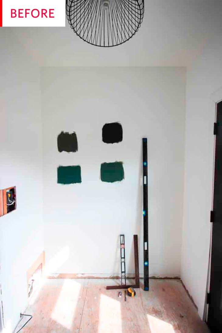 Minimal blacks, whites, and brass were used to accessorize final space, allowing the green wood accent wall to pop in contrast. Entryways are a home’s opportunity to make a first impression, and Lindi (and her very helpful friend, of course) have nailed this one.