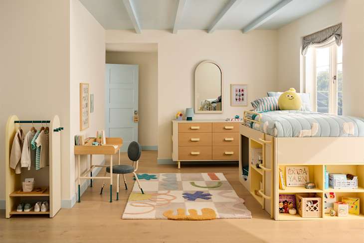 The collection has a cute, almost Scandi modern sensibility that’s bright and airy for kid-centric spaces, but items pack plenty of functionality that parents will appreciate. An adjustable desk and an adjustable desk chair can grow alongside kids by offering three height settings, and a wall-mounted desk with a cork board backing provides the ultimate small space-friendly homework time twofer.