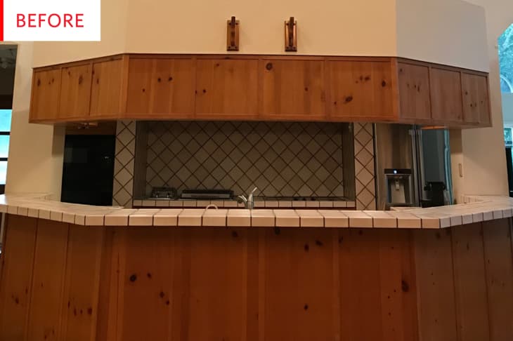 Prior to the renovation, our kitchen was dated, dark, and… orange! There was ’80s orange-toned wood everywhere and the countertops were tile. It had a dropped ceiling that made the area feel small and depressing. There was a weird build-out above the kitchen to support the weight of pre-existing upper cabinets, and the island/bar area was shaped like a half octagon. In addition to the cooktop, there was a built-in grill and even a fryer.
