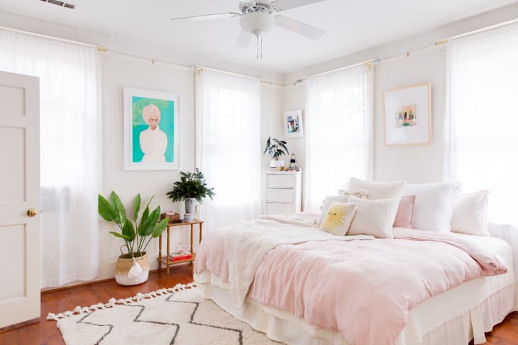 Not sure where to begin? Picture frames with cheesy sayings, posters of that band you loved eight years ago but couldn’t care less about now, and random t-shirts from high school sports leagues are likely all items that can go straight to the Goodwill pile. Things that can be purchased to make your space more adult-like? A few affordable throw pillow covers, some scented candles, and of course plants (real or fake will do). Marlowe also suggests downloading and printing free art from unsplash.com and framing it in thrift store or IKEA frames.