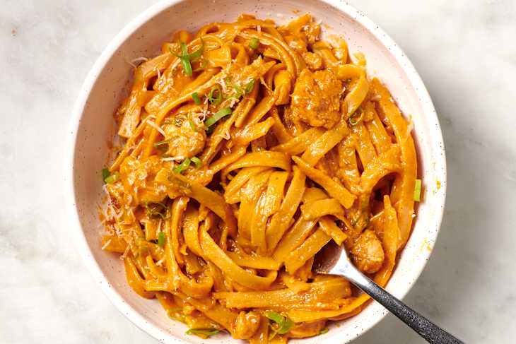 Both the Sweet and Spicy and Chili Crisp varieties come with wavy noodles that are handcrafted in Sichuan and sun-dried for 12 hours. Sweet & Spicy includes packets of Fly By Jing’s Sweet & Spicy Zhong Sauce, Soy Sauce/Black Vinegar, and Dried Chives. Chili Crisp includes packets of the brand’s iconic Sichuan Chili Crisp, Shallot Sauce, Soy Sauce/Black Vinegar, and Dried Chives. Prepping the noodles is simple: Boil water, add the noodles until cooked, then drain and mix in sauces and seasonings. Done!