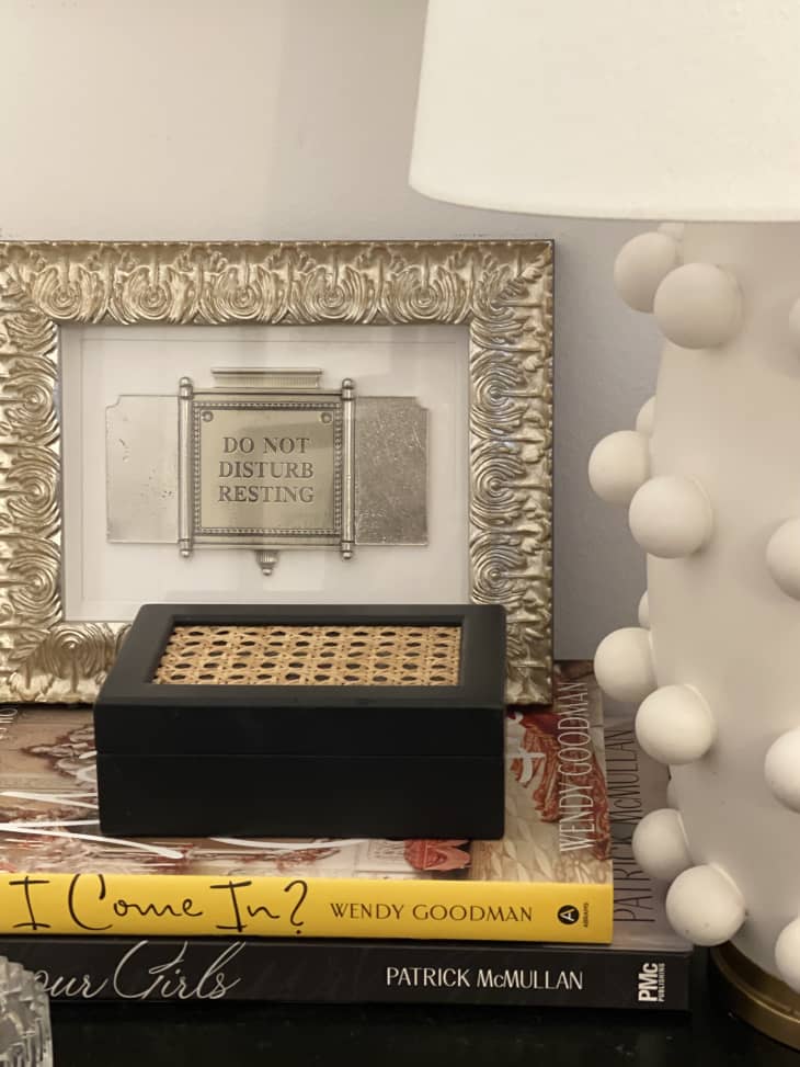 Because the piece has a bit of a glare, I recommend displaying it leaning. Mine is propped up on my nightstand, where it puts a smile on my face every time I crawl into bed. As a lover of historic homes, my hometown of DC, quirky messaging, and yes, SLEEP, this sign really was the perfect accent for my bedroom. Now if only I could somehow flash it in my noisy neighbors’ faces to get them to take the hint!