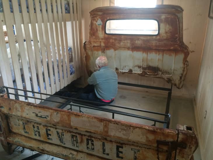 We worked on this project together, it required sawing the cab (now it’s the headboard) in half; sawing the tailgate off the truck body; wire brushing the rust off , etc. We carried the pieces into the house where we put the truck together again.