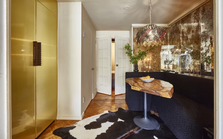Banquettes are a standard and stylish storage solution in White’s apartment. To match the moodiness of the surrounding space, White and her business partner custom-created the darker fabric that covers the banquettes in her dining area. Now, she can entertain several guests while being able to easily grab the light bulbs, tools, and other hardware stored inside of them.