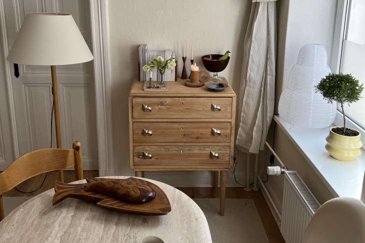 After stripping the green paint off of this three-drawered beauty and sanding it down to its blonde wood beginnings, Werner attached shell-shaped napkin rings to act as pulls. She thrifted the napkin rings with no real intention for them — mostly just because she loves “anything shell and vintage” — and then after stripping the dresser, she was in search of something a bit older and with more patina to match the dresser’s new look.