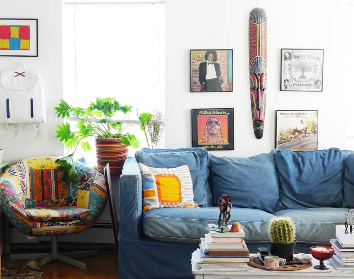 When Joy Cho had her daughter Ruby, Emily Henderson did a quick kid-friendly living room redo of her L.A. home. One of the things she did was cover the sofa cushion with a bright blue piece of fabric to protect it from grubby fingers. Although this was a (smart) preventative move, it also works after the fact, when you need to cover up food and pet stains, but aren’t quite ready to reupholster.