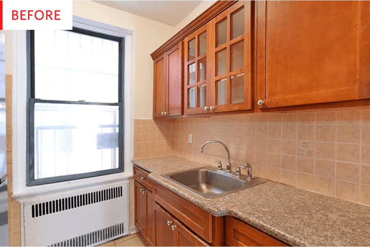 The galley kitchen of this Brooklyn apartment wasn’t in terrible shape, especially compared to some kitchens we’ve seen. But the builder-blah ’90s color scheme made the space seem dark and dated, and the wide-set floor tiles left lots of room for grout, which means lots of room for collecting dirt. The homeowner envisioned a remodel that would give the space a brighter, more modern style, but also one that would add more cabinet space to this small kitchen, without adding more floor space — via one simple trick.