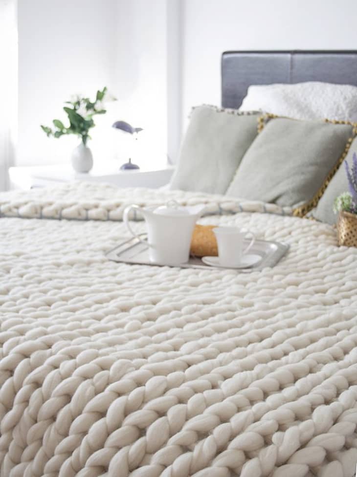 For a super chunky blanket, check out “arm knitting” videos on YouTube such as this one by Elise Berns who has written instructions and an accompanying video on her blog, Revert.
